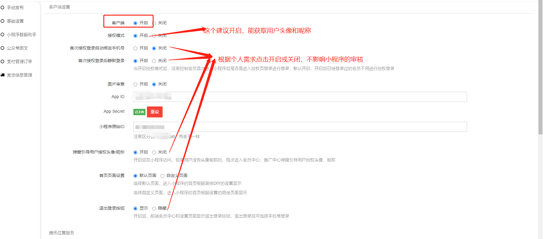 目录 搜索 展开 模王系统准备资料模王系统对接上线操作指南1、服务号的申请流程及认证2、申请小程序流程3、微信商家入驻流程4、开放平台绑定小程序和公众号5、公众号对接后台流程6、小程序对接后台流程7、模王系统支付对接操作指引8、小程序相关操作指引8.1提交小程序审核注意事项8.2小程序发布流程(用户隐私协议更新)8.3小程序发货管理系统8.4小程序备案8.5小程序用户隐私协议8.6小程序更换主体8.7开通小程序直播流程8.8小程序直播操作指南8.9关于小程序订单中心页设置的公告8.11小程序跳转H5页面8.12小程序更新版本8.13公众号快速注册并认证小程序8.14小程序年审8.15小程序客服8.16常见小程序问题1、怎么获取了聚合cps取链的小程序链接,在小程序打开空白?2、访问小程序商城:数据获取失败/获取用户信息失败/加载中3、小程序打开首页提示暂无浏览权限4、在小程序下单点击微信支付没反应5、小程序商城出现“签名验证失败,解决方法见:http://lbs.qq.com/faq/serve6、进小程序显示此key每日调用量已达到上限7、访问小程序显示 request:fail url not in domain list的处理方法8、在后台提交小程序审核,提交失败原因:tag is in invalid format hint:9、上传含直播小程序代码提示系统错误的原因10、小程序开发管理,接口设置提示暂无权限是什么问题?11、请求参数信息有误location参数格式有误12、小程序商品海报生成报错8.17小程序直播锁客规则8.18小程序对接企业微信客服8.19订单信息录入8.20【小程序平台】开通web-实时日志9、汇聚支付9.1汇聚支付-微信支付汇聚支付代付汇聚支付快捷支付10、支付宝支付10.1注册企业支付宝账号开通的操作指南10.2支付宝支付对接流程10.3支付宝提现流程10.4手机端注册企业支付宝账号11、短信配置11.1 阿里云短信对接后台11.2腾讯云短信配置12、企业付款到零钱功能开启(佣金发放功能)13、境外主体申请并认证服务号流程14、快递鸟15、企业微信设置企业微信后台企业微信部门企业微信-应用企业微信-员工16、微信服务商特约子商户关联说明17、打印机设置打印机添加模板商家转账到零钱申请文档参考系统设置模王系统-系统框架商城管理-概况商城管理-商品1、发布商品2、商品列表3、商品表单4、商品分类5、品牌管理6、配送模板7、评论管理8、优惠券管理9、商品标签10、退货地址设置11、满额优惠12、批量操作13、配送方式14、基础设置15、商品隐藏商城管理-会员1、全部会员2、会员等级3、会员分组4、资格申请5、会员设置会员合并机制说明6、推广中心设置7、会员邀请码使用记录8、会员关系链修改8.1关系链修改记录8.2会员导入9、会员合并记录10、账号注销管理11、会员设置中心商城管理-订单1、订单管理列表2、订单处理流程3、订单状态4、订单修改价格5、订单退款退货(文档说明)6、多包裹发货7、批量发货订单操作步骤8、催发货订单9、物流查询商城管理-财务1、余额设置2、会员余额3、充值记录4、转让记录5、余额明细6、收入明细7、提现设置8、提现统计9、提现记录 10、积分管理11、转账审核12、收益广告13、批量充值14、余额充值指定支付商城管理-系统1、商城入口2、商城设置①、商城设置百度统计功能②、订单设置③、物流查询④、短信阿里云短信配置腾讯云短信设置腾讯云短信资质管理⑤、联系方式⑥、分类⑦、优惠券⑧、分享⑨、幻灯片⑩、广告位⑪、资产密码⑫、地图设置⑬、API应用⑭、邮箱配置3、交易设置客服设置4、支付方式微信支付聚合支付其他支付微信支付/提现异常提示说明5、微信模板消息自定义消息模板(新版)自定义消息模板小程序消息模板公众号模板消息变更公告6、语言设置7、权限管理8、多媒体管理商城管理-消息商城管理-应用商城管理-统计2.0商城管理-装修DIY1、模板管理2、店铺页面2.1、装修增加跳转视频号2.2增加抖音装修类型3、顶部导航4、底部导航5、DIY模板市场6、首屏广告7、创客贴--图片智能设计8、基础设置9、装修DIY尺寸建议模王系统入口类1、小程序2、公众号2.1自定义菜单-公众号底部导航2.2自动回复2.3素材管理2.4粉丝管理2.5公众号常见问题2.6更换域名后公众号/小程序/商城等需要调整的内容3、pc前端模板3.1基础设置3.2广告管理-PC端模板1设置3.3首页商品设置3.4前端页面3.5登录方式3.6PC端--PC端模板24、APP设置4.1基础设置4.2APP分享4.3消息推送4.4消息列表4.5APP页面装修4.6打包封装APP需要提供的资料清单1、如何注册和认证微信开放平台 2、如何创建APP移动应用?3、App微信支付接入4、如何获取商城封装APP的隐私政策和用户协议链接 4.7【安卓版】APP发布方案 5、子平台模王系统行业类插件操作指南1、供应商1.供应商操作手册2.后台供应商插件3.供应商基础设置4.供应商前端页面显示5.供应商保单功能-可供保险行业提交保单信息使用2、门店-收银台1、门店申请和使用步骤2、门店管理①、门店-收银台 营销设置②、门店-收银台 分润设置连锁店老板3、门店分类4、门店申请5、门店审核6、门店商品7、门店商品订单8、收银台订单9、提成明细10、数据统计11、核销员12、基础设置收银台买单增加语音播报功能(会员推送)13、默认设置14、门店装修15、门店余额16、门店独立模板17、门店广告18、收银台语音播报3、上门安装4、门店配送5、微社区6、跑腿配送7、同城配送8、虚拟