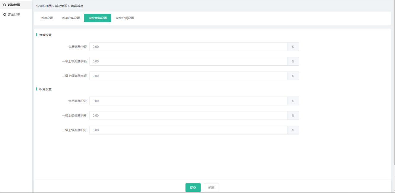 (4)营销设置和分润可设置活动定金的营销及分润信息,相应插件如未开启,则无法     设置,分润中所有插件都没开启则不会有分润设置导航;