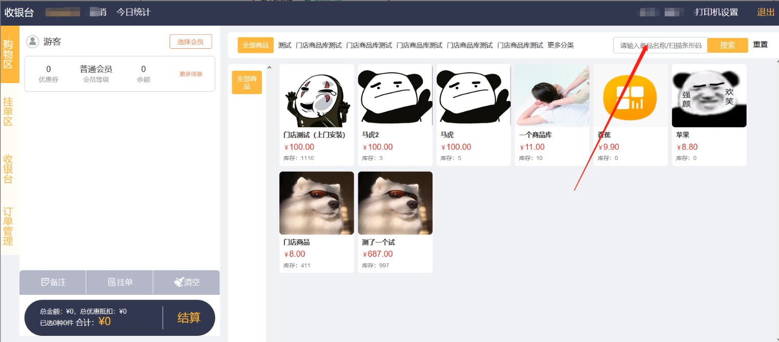 Pos收银:注意需要先点击搜索框后再使用扫码枪扫描条形码后会自动加入到左侧购物区