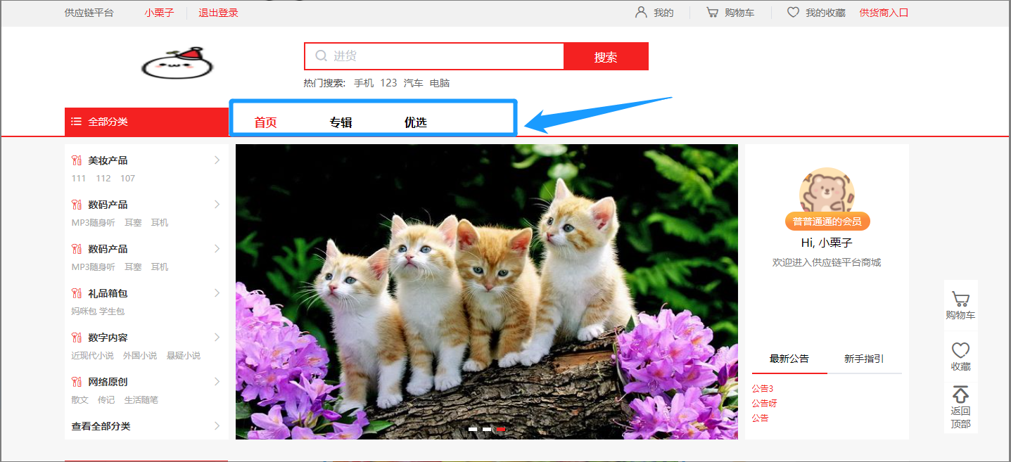 显示在采购商城的右侧,点击相应标题可进入详情页面,除了【首页公告】,可以自定义增加显示,比如图中的【新手指引】