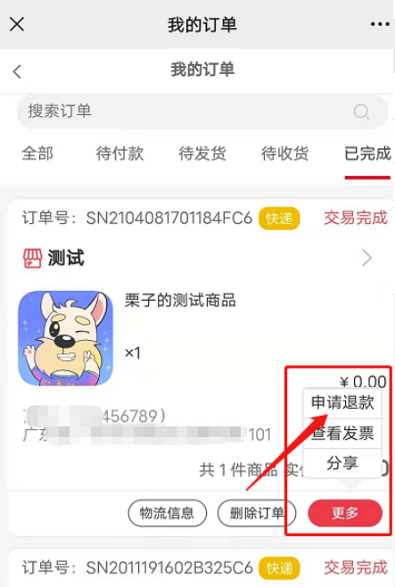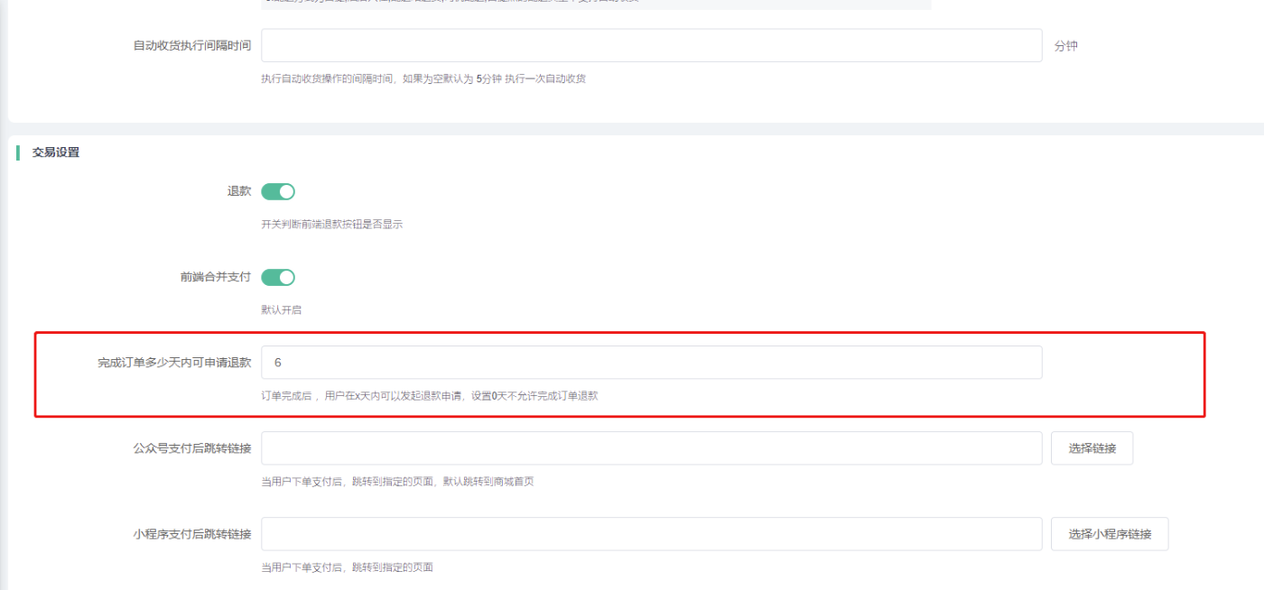 3)完成订单多少天内可申请退款:设置订单完成n天内可发起退款申请,如果设置0则不允许完成订单退款。