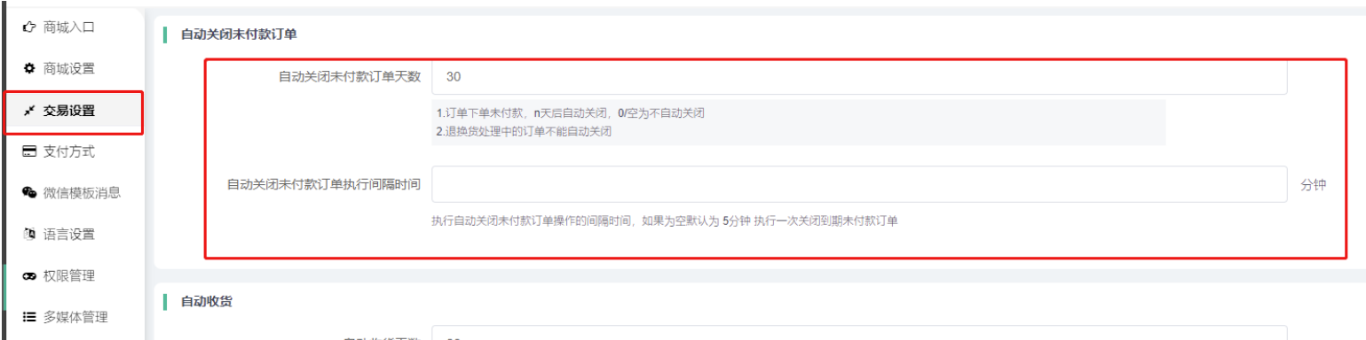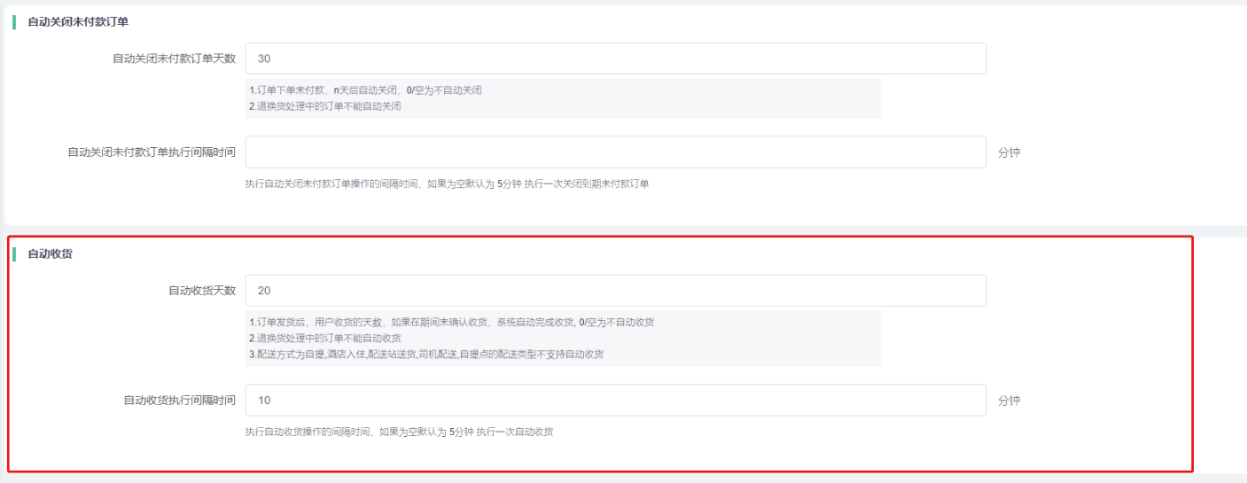 1)自动收货天数:设置订单发货后,用户收货的天数,如果在期间未确认收货,系统自动完成收货,空为不自动收货;