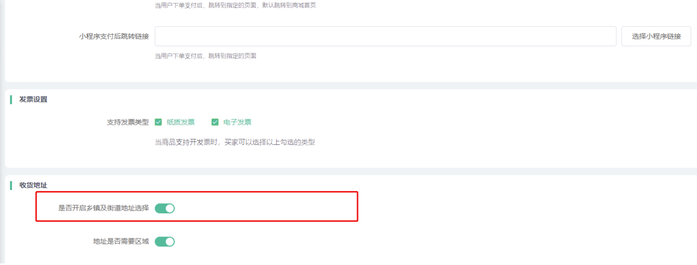 5)收货地址:开启乡镇及街道地址选择,系统默认显示省-市-区(县)三级地址选择,如果开启这个选项,支持让用户选择乡镇/街道。